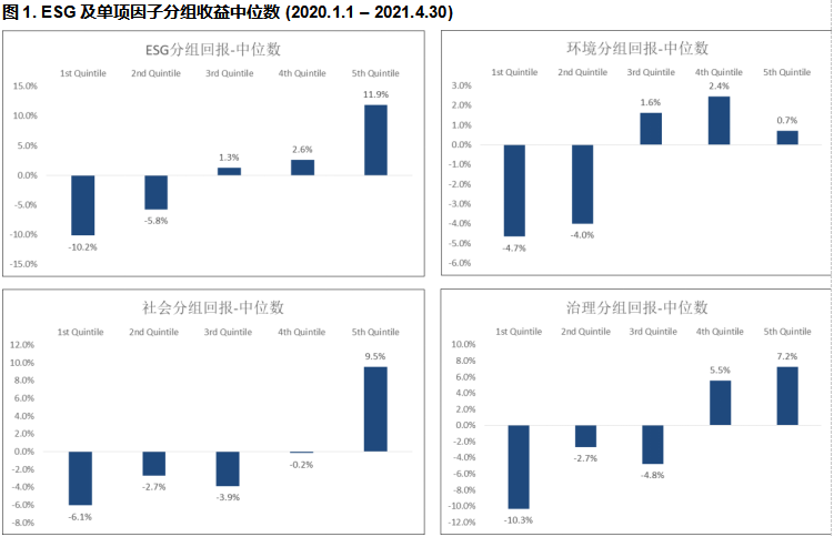 在經(jīng)歷了第一波疫情高峰后,雖然全國日確診數(shù)量曲線逐漸平緩,然而各地小范圍疫情爆發(fā)此消彼長,防控壓力仍不容小覷,隨著疫苗接種率的快速提升和經(jīng)濟(jì)復(fù)蘇的步伐加快,中國率先迎來了“后疫情時(shí)代”。我們的研究題目轉(zhuǎn)向了觀察ESG是否在復(fù)蘇中對(duì)企業(yè)經(jīng)營業(yè)績(jī)和股價(jià)表現(xiàn)起到正向作用。因此,本次我們將ESG因子的觀察期延至2021年4月,觀察自疫情開始至今ESG領(lǐng)先者的股價(jià)表現(xiàn)。我們的研究結(jié)果顯示ESG表現(xiàn)優(yōu)秀的公司在后疫情時(shí)期也持續(xù)創(chuàng)造更好的收益。