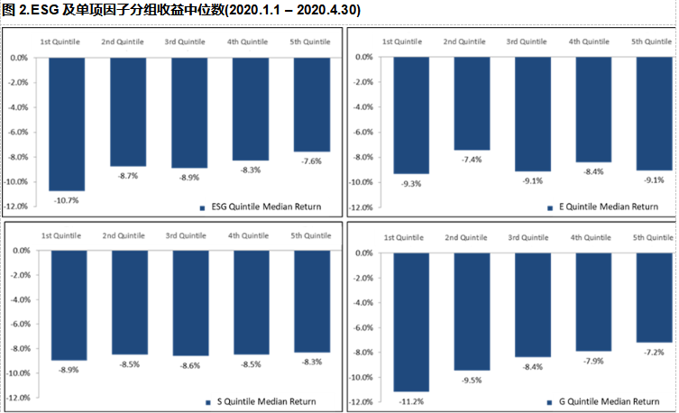 我們2020年1-4月觀察結(jié)果僅顯示了G因子有較強(qiáng)區(qū)分效果和一致性(圖2),而此次延長觀察期到今年4月后,我們看到E、S和G三個(gè)單項(xiàng)因子普遍呈現(xiàn)高的相關(guān)性,且其中S和G因子一致性和效果最佳。S和G最高分組在回報(bào)中位數(shù)方面分別高于最低分組15.6%和17.5%(圖1)。這表明,后疫情時(shí)期市場(chǎng)持續(xù)為對(duì)治理和社會(huì)表現(xiàn)優(yōu)異的公司提供溢價(jià)。我們認(rèn)為這些S和G 的因素,特別是管理和領(lǐng)導(dǎo)力、突發(fā)事件應(yīng)對(duì)能力、業(yè)務(wù)持續(xù)性計(jì)劃、員工福利、健康安全、社會(huì)支援等,都有助于公司在面臨大規(guī)模公共衛(wèi)生危機(jī)時(shí)更快的恢復(fù)經(jīng)營甚至將危機(jī)轉(zhuǎn)化成業(yè)務(wù)機(jī)遇,提升競(jìng)爭(zhēng)力。這一結(jié)果也進(jìn)一步證實(shí)治理因素一直是A股市場(chǎng)影響企業(yè)質(zhì)量和財(cái)務(wù)表現(xiàn)的核心要素之一,也是市場(chǎng)一直以來的共識(shí)。我們留意到,治理因子的超額回報(bào)主要來自于最低分組的弱勢(shì),這表明治理因子可能在識(shí)別落后者方面比辨識(shí)領(lǐng)導(dǎo)者更加有效。