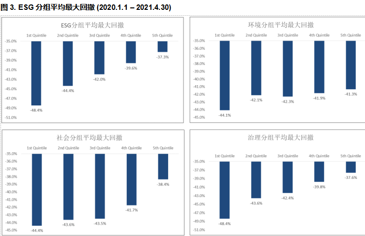 萬得全A指數(shù)在2020年1月1日至2021年4月30日之間上漲了24.55%。同期我們看到,ESG評(píng)分與回報(bào)持續(xù)呈現(xiàn)較強(qiáng)的正相關(guān)關(guān)系,這也與我們之前的測(cè)試結(jié)果一致。其中ESG評(píng)分最高的第5組回報(bào)中位數(shù)高于分?jǐn)?shù)最低的第1組22.1%,這證實(shí)了ESG領(lǐng)先者在短期市場(chǎng)低迷時(shí)期跑贏大市以及之后更強(qiáng)的股價(jià)回彈的能力。