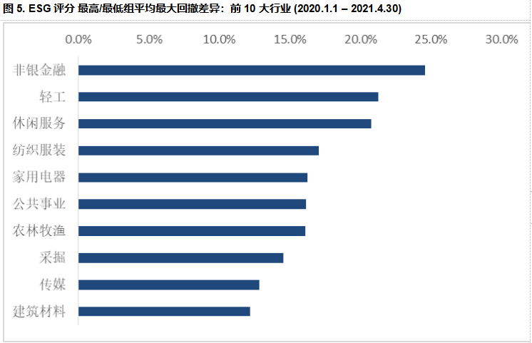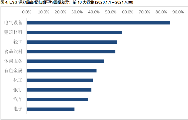 我們觀察到,在28個(gè)申萬一級(jí)行業(yè)中的24個(gè)中, ESG行業(yè)領(lǐng)先者(ESG評(píng)分最高20%組)都在一定程度上跑贏了落后者,ESG行業(yè)領(lǐng)先者優(yōu)勢(shì)最大的前十大行業(yè)中,平均收益的優(yōu)勢(shì)在28.4%到85.2%之間,其中分度最明顯的是電氣設(shè)備,建筑材料,輕工行業(yè)和食品飲料,如圖4所示。