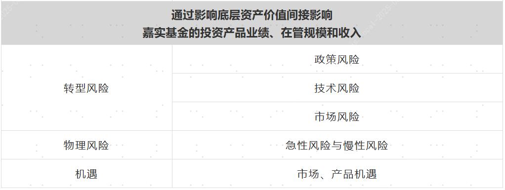嘉實(shí)基金主要依據(jù)氣候相關(guān)財(cái)務(wù)信息披露工作組(TCFD)建議的框架,識(shí)別和評(píng)估氣候相關(guān)風(fēng)險(xiǎn)與機(jī)遇對(duì)標(biāo)的資產(chǎn)的影響,并基于中國(guó)氣候政策要求、產(chǎn)業(yè)結(jié)構(gòu)和市場(chǎng)發(fā)展階段進(jìn)行本土化調(diào)整和落地。