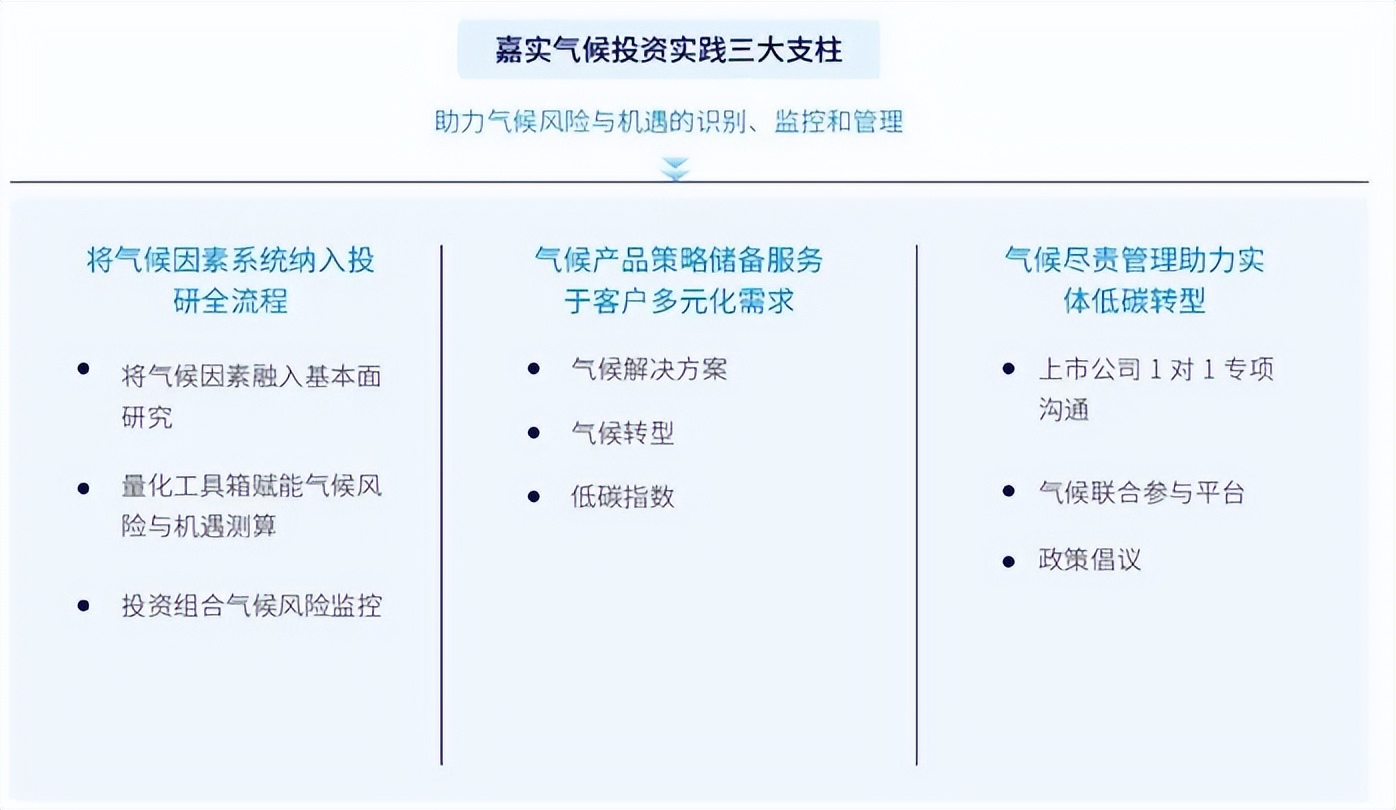 嘉實(shí)基金氣候投資實(shí)踐包括以下三大支柱,其核心是在投資研究、組合管理、風(fēng)險(xiǎn)管理、策略和產(chǎn)品構(gòu)建,及盡責(zé)管理等投研全流程納入氣候變化因素,以期更全面地管理氣候風(fēng)險(xiǎn)、把握氣候機(jī)遇。