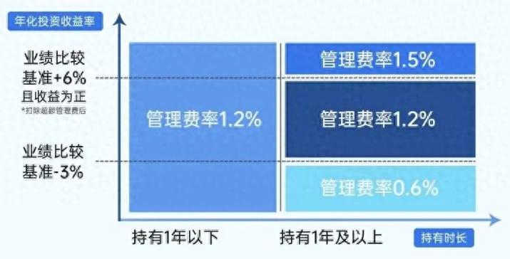 (注:具體費(fèi)率標(biāo)準(zhǔn)以基金合同約定及實(shí)際情況為準(zhǔn)。持有期限不足一年(即365天,下同),則按1.20%年費(fèi)率收取管理費(fèi);持有期限達(dá)到一年及以上,則根據(jù)持有期間年化收益率分為以下三種情況,分別確定對(duì)應(yīng)的管理費(fèi)率檔位:若持有期間相對(duì)業(yè)績(jī)比較基準(zhǔn)的年化超額收益率(扣除超額管理費(fèi)后)超過(guò)6%且持有收益率(扣除超額管理費(fèi)后)為正,按1.50%年費(fèi)率確認(rèn)管理費(fèi);若持有期間的年化超額收益率在-3%及以下,按0.60%年費(fèi)率確認(rèn)管理費(fèi);其他情形按1.20%年費(fèi)率確認(rèn)管理費(fèi)。)