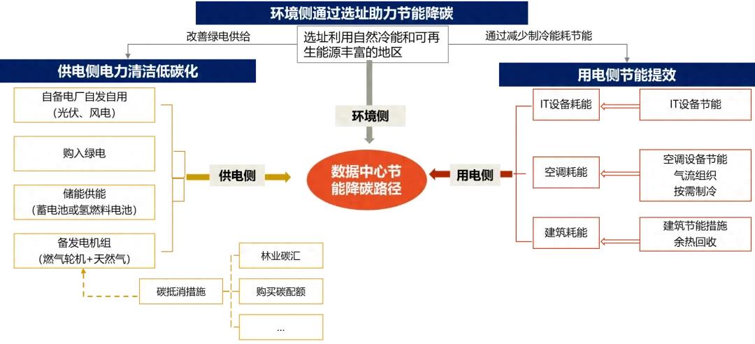 數(shù)據(jù)中心是AI模型運(yùn)營和硬件部署的核心場景,數(shù)據(jù)中心的綠色低碳將直接決定AI運(yùn)營碳足跡和AI隱含碳的分?jǐn)傂?。一方面,AI 模型的訓(xùn)練和推理依賴數(shù)據(jù)中心電力,數(shù)據(jù)中心的碳排放(如電力碳強(qiáng)度)直接影響運(yùn)營碳,另一方面,數(shù)據(jù)中心硬件的隱含碳需通過模型的生命周期分?jǐn)?,若?shù)據(jù)中心硬件壽命短隱含碳分?jǐn)偛蛔悖瑫?huì)推高單個(gè)AI模型的總碳足跡。數(shù)據(jù)中心是AI碳足跡的核心載體,其降碳不僅是環(huán)境要求,更是AI可持續(xù)發(fā)展的必要前提。我國數(shù)據(jù)中心行業(yè)用能90%以上為電能,而70%左右的電力供應(yīng)仍依賴煤電,減碳空間巨大。從轉(zhuǎn)型路徑看,需從用電側(cè)、供電側(cè)與環(huán)境側(cè)三方面協(xié)同發(fā)力,構(gòu)建全鏈條的低碳發(fā)展體系。